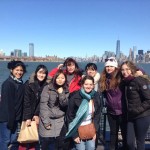写真は、自由の女神の前で撮ったものです。後ろの街並みがニューヨークです。